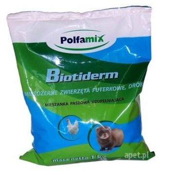Mieszanka paszowa uzupełniająca-mineralna Biotiderm to preparat z biotyną dla mięsożernych zwierząt futerkowych oraz drobiu. Biotiderm stosuje się w żywieniu mięsożernych zwierząt futerkowych oraz psów i kotów. Zawarta w preparacie biotyna wpływa na poprawę gęstości włosów i ich sprężystość co jest szczególnie ważne w okresie formowania i dojrzewania okrywy włosowej. Wpływa również na poprawę upierzenia ptaków oraz wylęgowości piskląt. Niedobory biotyny mogą prowadzić do chorób skóry.