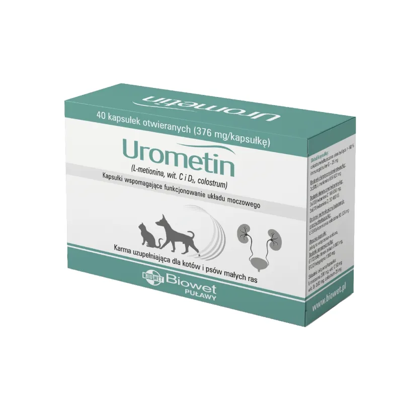 Biowet Urometin 40 kapsułek Wspomaga Układ Moczowy dla Psa i Kota (L-metionina, wit. C i D3, colostrum) Kapsułki wspomagające funkcjonowanie układu moczowego Karma uzupełniająca dla kotów i psów małych ras Właściwości Aminokwas L-metionina wspomaga proces rozpuszczania kamieni struwitowych poprzez obniżenie pH moczu. Witamina D3 poprawia przyswajalność i wyrównuje stosunek wapnia i fosforanów w nerkach. Wpływa na prawidłowe funkcjonowanie układu odpornościowego. Witamina C chroni komórki przed szkodliwym działaniem wolnych rodników, wspomaga zakwaszanie moczu. Colostrum zawiera immunoglobuliny wspierające układ odpornościowy organizmu. Wskazania: – wspomagająco w leczeniu kamicy struwitowej oraz w jej zapobieganiu – profilaktycznie w nawracających zakażeniach pęcherza moczowego i cewki moczowej – w celu zakwaszenia moczu Sposób stosowania: 1 kapsułka dwa razy dziennie. Zawartość kapsułki można wymieszać z inną karmą. Jeżeli sposób odżywiania oparty jest wyłącznie na suchej karmie, należy lekko zwilżyć karmę, tak aby proszek przylegał do żywności i został spożyty. Produktu nie należy stosować z innymi karmami obniżającymi pH moczu. Urometin najlepiej stosować po konsultacji z lekarzem weterynarii. Skład/kapsułkę: colostrum (odłuszczona siara bydlęca > 60 % Immunoglobuliny G) – 15 mg Dodatek dietetyczny/aminokwas/kg: 3c305/L-metionina 666 622 mg Dodatki dietetyczne/witaminy/kg: 3a300/witamina C 166 656 mg, 3a671/witamina D3 30 400 IU Dodatek technologiczny/substancja przeciwzbrylająca/kg: E 551b/krzemionka koloidalna 83 328 mg Otoczka kapsułki: żelatyna wieprzowo-wołowa, dodatki sensoryczne/kg: E172/żółty tlenek żelaza 3 000 mg, E132/indygotyna 1300 mg Składniki aktywne/kapsułka: L-metionina 200 mg, wit. C 50 mg, wit. D3 0,02 mg, colostrum 25 mg Składniki analityczne: białko surowe 58,6 %, popiół surowy 5,9 %, tłuszcz surowy < 1,0 %, włókno surowe < 0,3 %, wilgotność 4,1 % Warunki przechowywania Chronić od światła i wilgoci. Opakowanie 40 kapsułek otwieranych (376 mg/kapsułkę)