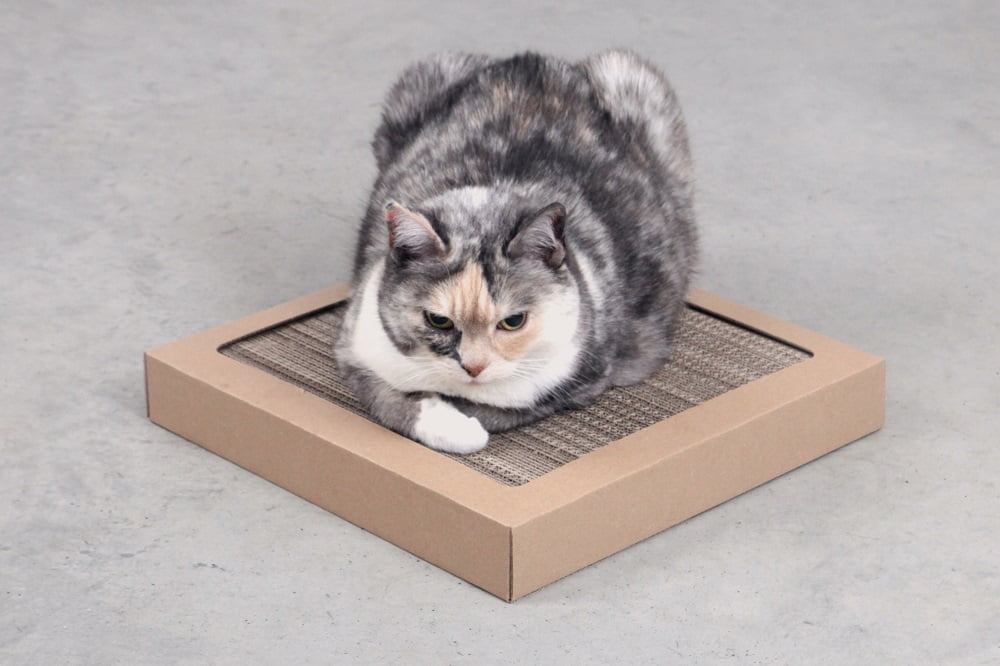 Posiada ramkę aby ograniczyć rozsypanie się wydrapanej tektury poza drapak.