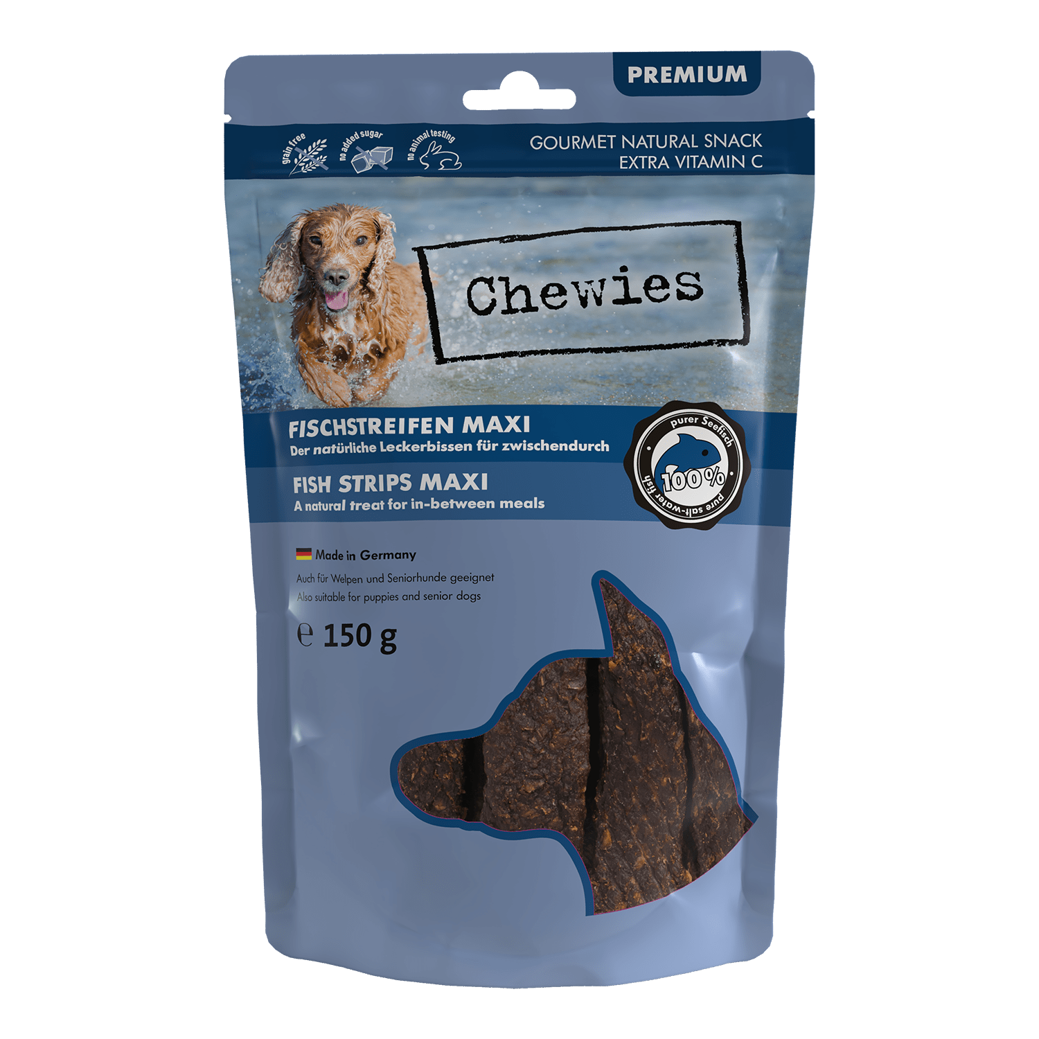 Chewies Paski mięsne Kaczka to delikatnie suszone mięso z dodatkiem witaminy C. Dzięki specjalnej produkcji wysokiej jakości składniki odżywcze mięsa są prawie całkowicie zachowane. Paski mięsne do żucia to pyszna i zdrowa nagroda między posiłkami. Są wyprodukowane w Niemczech, a surowce w miarę możliwości pochodzą z Niemiec. Kawałki mięsa do żucia to pyszna przekąska dla Twojego psa! Chewies – 100% pies!