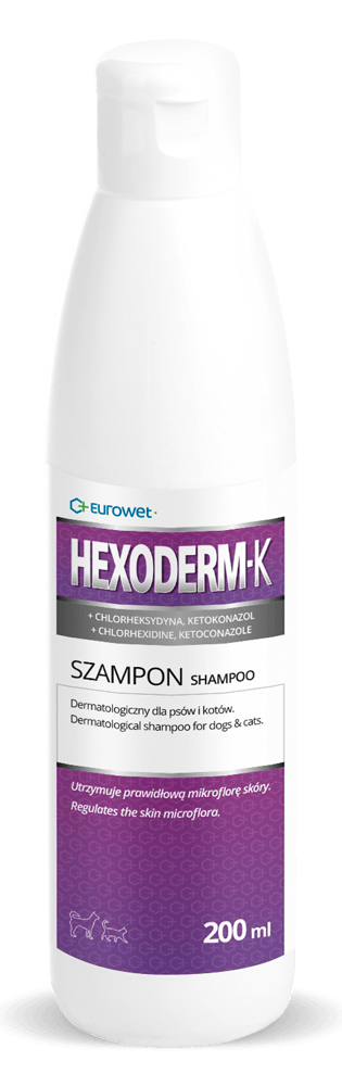 EUROWET Hexoderm-K 200ml szampon dermatologiczny to zaawansowany szampon dla psów i kotów, który skutecznie reguluje mikroflorę skóry, stabilizuje jej pH oraz zapobiega wysuszaniu. Formuła tego dermokosmetyku weterynaryjnego zawiera chlorheksydynę i ketokonazol, które działają przeciwbakteryjnie, przeciwgrzybiczo i przeciwdrożdżakowo, zwalczając szkodliwe mikroorganizmy odpowiedzialne za dolegliwości skórne. Dzięki zawartości łagodnych środków myjących, szampon jest idealny do częstego stosowania, nawet dla zwierząt z wrażliwą skórą.