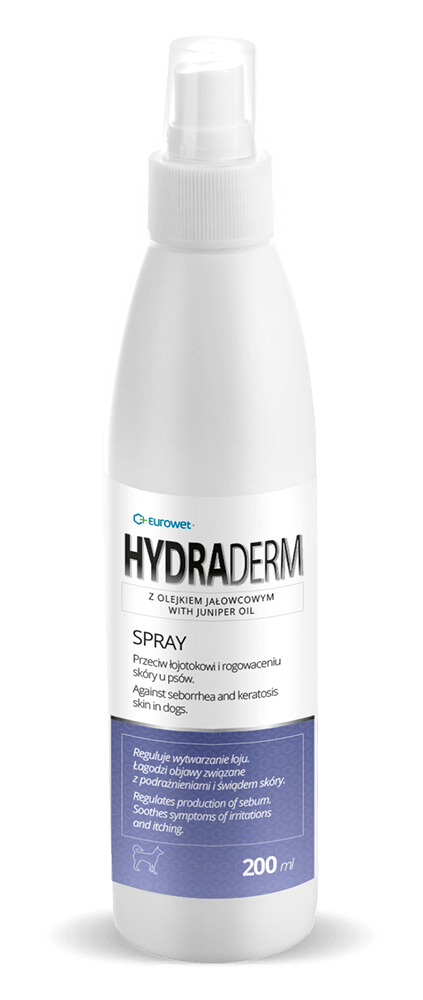 EUROWET Hydra Derm 200ml Spray przeciw łojotokowi to dermokosmetyk weterynaryjny stworzony specjalnie, aby wspomagać skórę zwierząt z problemami dermatologicznymi takimi jak łojotok. Dzięki zawartości dziegciu z jałowca, produkt ten efektywnie wpływa na prawidłowe wytwarzanie łoju oraz zapobiega nadmiernemu rogowaceniu naskórka, łagodząc jednocześnie objawy związane z podrażnieniami skóry. Dodatkowo, obecna w składzie gliceryna zmiękcza skórę, ułatwiając jej nawilżenie, łagodząc uczucie świądu oraz nadając sierści zdrowy połysk.