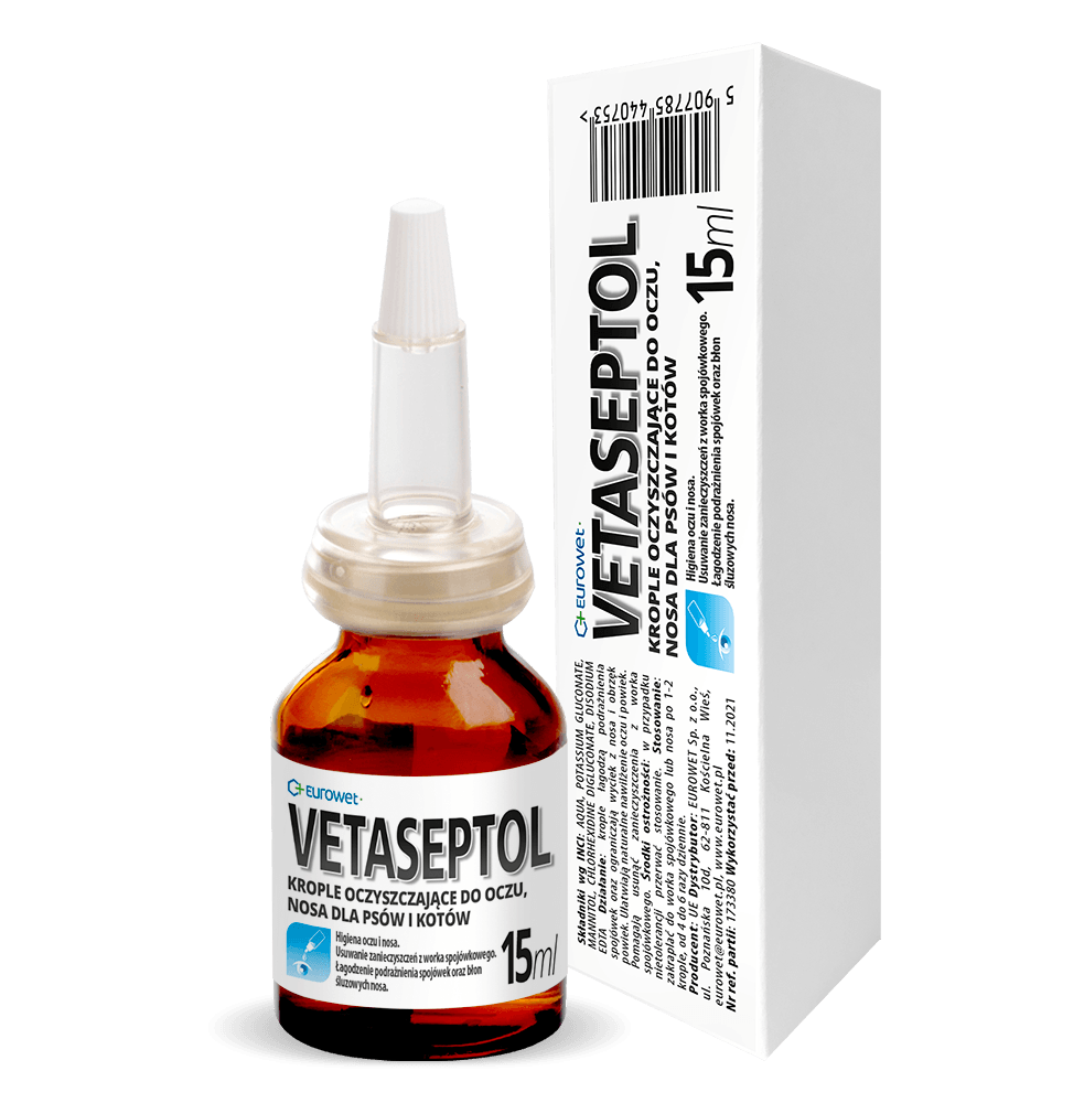 EUROWET Vetaseptol krople 15ml to specjalistyczny preparat stworzony z myślą o higienie oczu i nosa u psów i kotów. Krople skutecznie pomagają usuwać zanieczyszczenia z worka spojówkowego, jednocześnie łagodząc podrażnienia spojówek oraz błon śluzowych nosa. Dzięki swoim właściwościom preparat ogranicza wyciek z nosa, redukuje obrzęk powiek i wspiera naturalne nawilżenie oczu oraz powiek. Vetaseptol to niezastąpione wsparcie w codziennej pielęgnacji wrażliwych okolic oczu i nosa u zwierząt domowych.