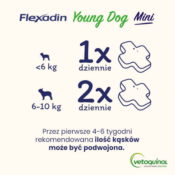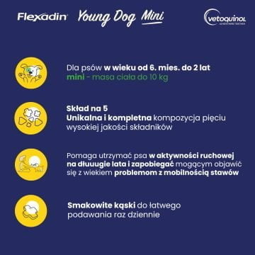 Flexadin Young Dog Mini jest rekomendowany do 2. roku życia psa.