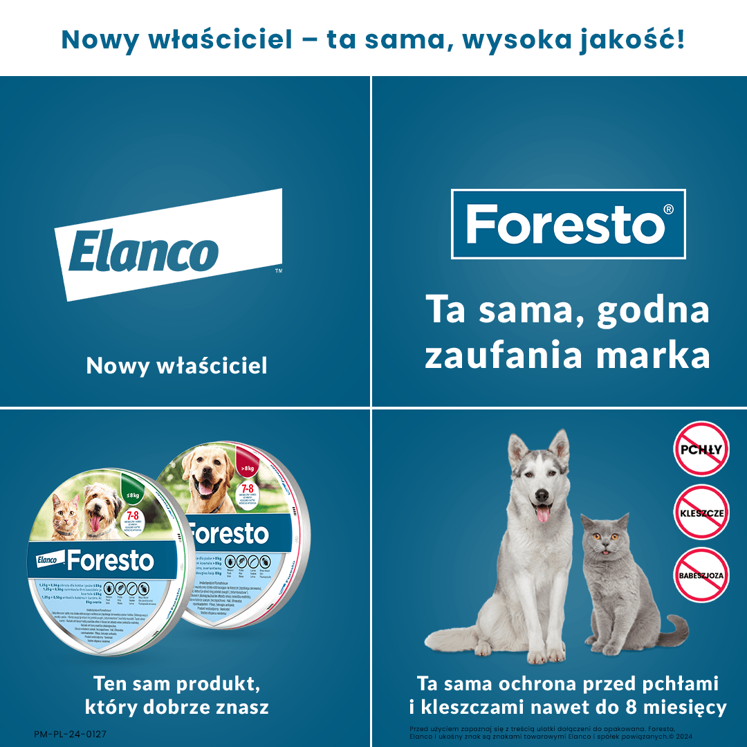 FORESTO Obroża na kleszcze i pchły dla małych psów i kotów to więcej niż zwykła obroża przeciw kleszczowa. Jest to kompleksowe rozwiązanie, które chroni Twojego małego psa lub kota przez długi czas, jednocześnie będąc wygodnym w stosowaniu. Dzięki swojej wodoodporności i trwałości, obroża FORESTO dla psów poniżej 7kg oraz dla kotów jest idealnym wyborem dla aktywnych zwierząt, które spędzają dużo czasu na zewnątrz, zapewniając ciągłą ochronę niezależnie od warunków pogodowych. Jest to produkt wysokiej jakości, który łączy innowacyjność z efektywnością, oferując bezpieczeństwo i spokój zarówno zwierzętom, jak i ich właścicielom.