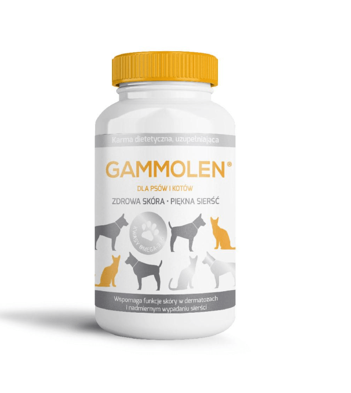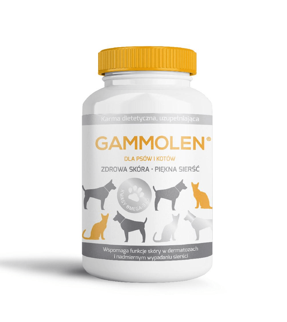Gammolen – suplement dietetyczny dla psów i kotów. Wspomaga funkcje skóry w przypadku stanów zapalnych i nadmiernego wypadania sierści. Zmniejsza ilość gubionego włosa, poprawia stan skóry i wygląd okrywy włosowej.