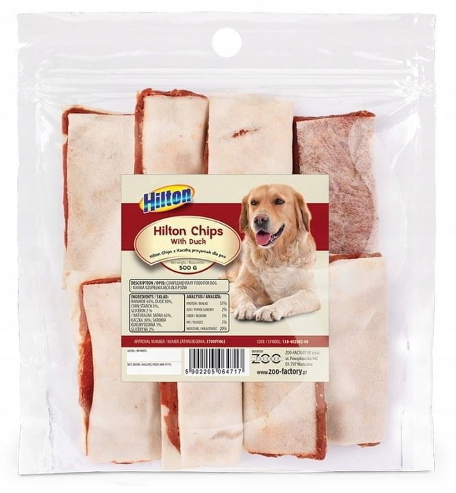 HILTON CHIPS Z KACZKĄ 500g PrzysmakKarma uzupełniające dla psów.Skład:Naturalna skóra – 65%Kaczka – 30%Skrobia kukurydziana – 3%Gliceryna 2%Analiza:Białko – 55%Popiół surowy – 2%Błonnik – 3%Tłuszcz – 3%Wilgotność – 20%Zalecane karmienie:podawać jako przysmak, nagrodowo podczas tresury lub jako przekąskę. Należy zawsze zapewnić zwierzęciu dostęp do świeżej wody. Produkt nie zastępuje codziennego pełnoporcjowego pożywienia.Hilton to polska marka, która tworzy smakowite karmy i przysmaki dla psów. Hilton to pełnowartościowe posiłki, które dostarczą Twojemu pupilowi wszystkich niezbędnych wartości odżywczych, witamin i minerałów. Bez sztucznych aromatów, wzmacniaczy smaku, konserwantów, barwników oraz bez składników modyfikowanych genetycznie. Za marką Hilton stoją lekarze weterynarii i miłośnicy zwierząt, którzy swoją wiedzę i pasję przekuwają w produkty najwyższej jakości. Wybierając smakołyki Hilton zyskujesz pewność, że podajesz swojemu pupilowi to, czego potrzebuje!