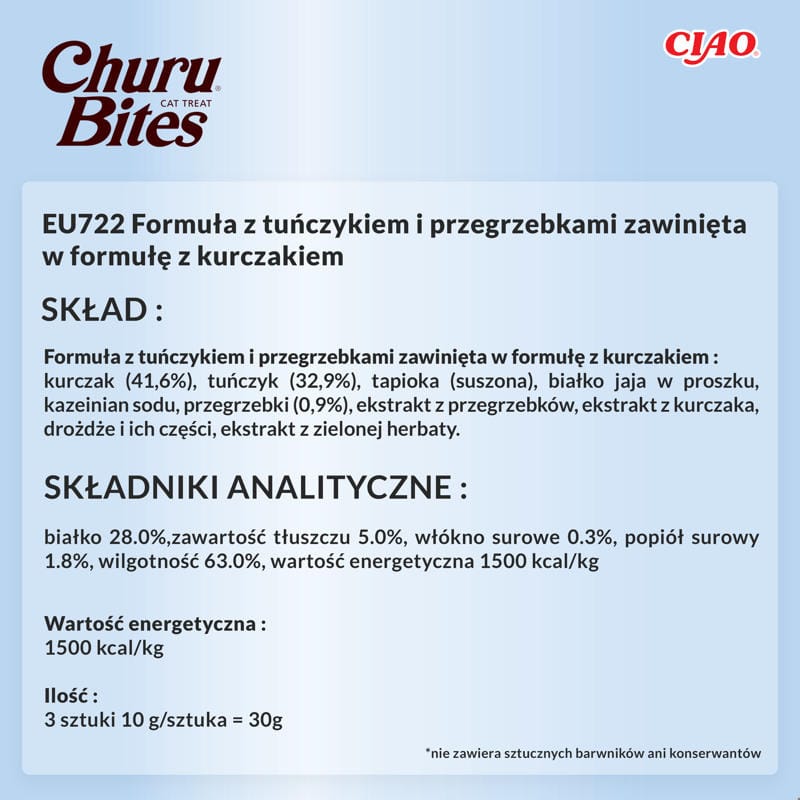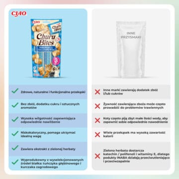 INABA CAT Churu Bites kurczak z tuńczykiem i małżą to wyjątkowa uzupełniająca karma dla kotów, która łączy w sobie wysoką jakość składników oraz niezwykłe walory smakowe. Każdy kawałek tej przekąski, w kształcie poduszki, składa się z delikatnie pieczonego kurczaka na zewnątrz i kremowego nadzienia Churu®, co dostarcza kotom niezapomnianych doznań smakowych. Ta karma jest nie tylko pyszna, ale również zdrowa, ponieważ jest produkowana z najwyższej jakości składników „human grade”, co oznacza, że są one bezpieczne i odpowiednie do spożycia przez ludzi. Dodatkowo, Churu Bites są niskokaloryczne, wolne od zbóż i konserwantów, co czyni je idealnym wyborem dla kotów z wrażliwym żołądkiem oraz dla tych, które potrzebują zredukowanej ilości kalorii w diecie. Ich unikalna tekstura ułatwia także podawanie tabletek lub suplementów, co sprawia, że są doskonałym rozwiązaniem dla właścicieli, którzy dbają o zdrowie swoich pupili.