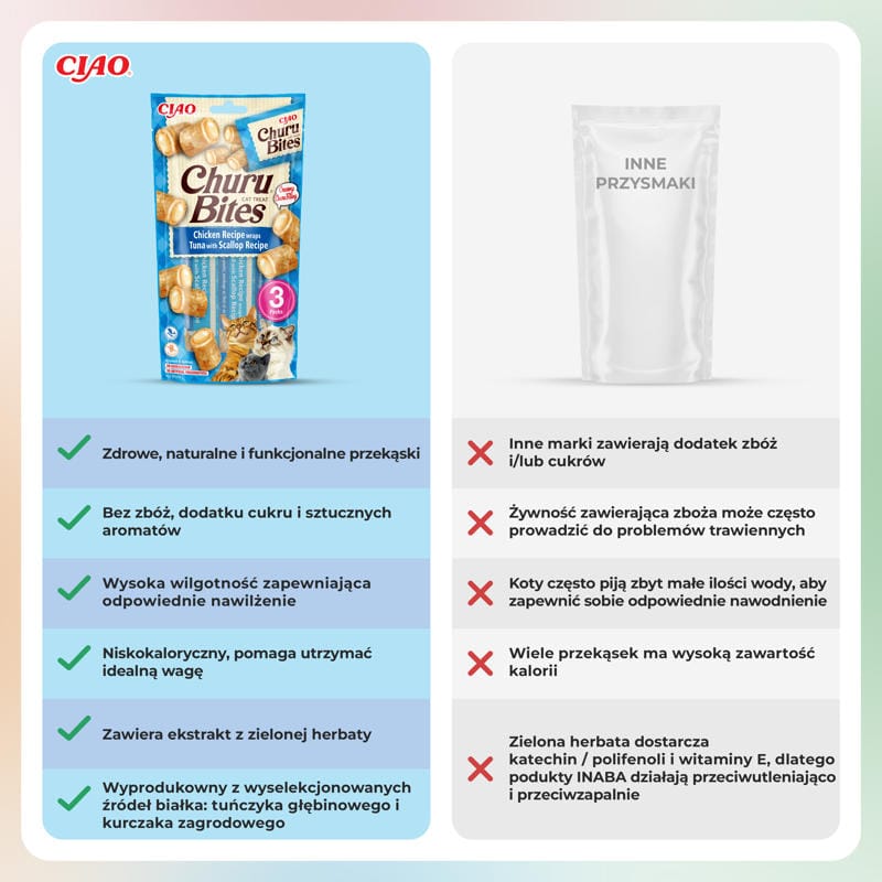 Czy INABA CAT Churu Bites kurczak z tuńczykiem i małżą są odpowiednie dla kotów z alergiami pokarmowymi?