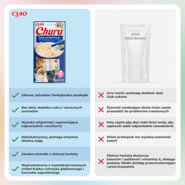 INABA CAT Churu tuńczyk z wołowinę to wyjątkowy przysmak, który stanowi doskonałe uzupełnienie diety Twojego kota. Dzięki unikalnej, kremowej konsystencji, produkt ten zyskuje uznanie wśród wszystkich czworonogów, oferując nie tylko smakowitość, ale także korzyści zdrowotne. Churu to niskokaloryczne przysmaki, które nie zawierają zbóż ani konserwantów, co czyni je idealnym wyborem dla kotów z wrażliwym żołądkiem. Oparte na najwyższej jakości składnikach, takich jak mięso z kurczaka z wolnego wybiegu i tuńczyk z certyfikowanych połowów, przysmaki te wspierają zdrowie i kondycję Twojego pupila, dostarczając mu niezbędnych składników odżywczych.