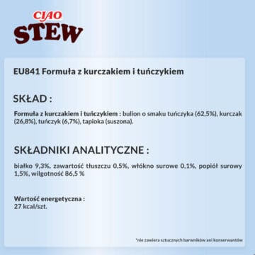 INABA CAT Ciao Gulasz zawiera wysokiej jakości mięso z kurczaka i tuńczyka, które są źródłem białka wspierającego zdrowie i witalność kota.