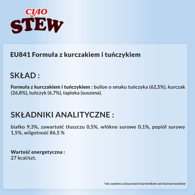 INABA CAT Ciao Gulasz zawiera wysokiej jakości mięso z kurczaka i tuńczyka, które są źródłem białka wspierającego zdrowie i witalność kota.