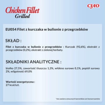 INABA CAT Filet z grillowanego kurczaka to doskonały wybór dla każdego właściciela kota, który szuka zdrowej i smacznej przekąski dla swojego pupila. Filet przygotowany z najwyższej jakości składników, bez zbóż, konserwantów i sztucznych dodatków, jest idealny nawet dla kotów o wrażliwym układzie pokarmowym. Wysoka wilgotność produktu wspomaga nawodnienie kota, co jest kluczowe dla zdrowia układu moczowego. Dzięki niskiej kaloryczności, przysmak ten można podawać kotom na diecie, bez obaw o nadmierny przyrost masy. Innowacyjne opakowanie, które chroni przed promieniowaniem UV oraz próżniowe pakowanie, gwarantują zachowanie najwyższej świeżości i smaku.