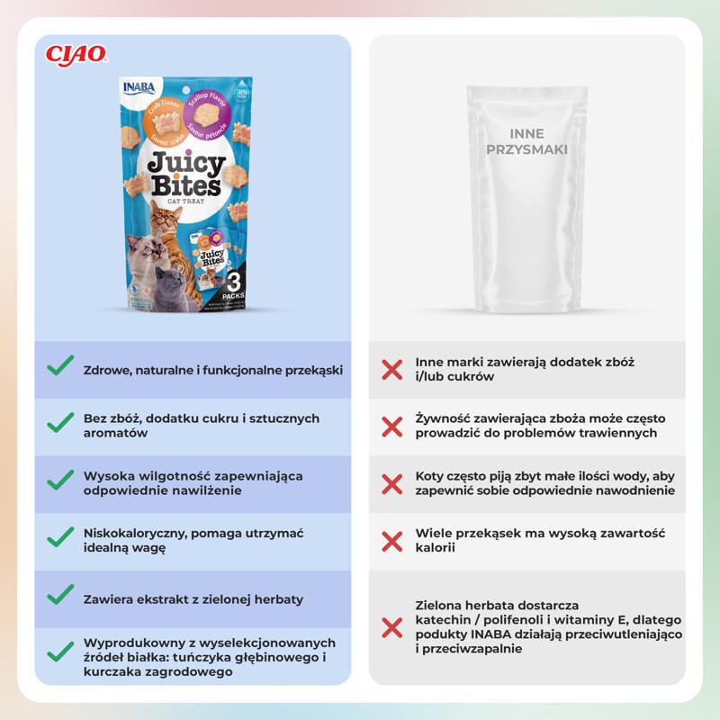 INABA CAT Soczyste Kęsy małża i krab to wybór, który łączy wyjątkowy smak z pełnym bezpieczeństwem dla Twojego kota. Przysmak jest pozbawiony zbóż i sztucznych dodatków, co sprawia, że jest odpowiedni także dla kotów z wrażliwym żołądkiem i alergiami. Dodatkowo składniki są najwyższej jakości, klasy „human grade”, co oznacza, że spełniają standardy żywieniowe dla ludzi. Dwa różne smaki w jednym opakowaniu pozwalają urozmaicić dietę kota i dostarczyć mu nowe, ekscytujące doznania smakowe. Dzięki trzem osobnym opakowaniom produkt długo zachowuje świeżość, co jest wygodne zarówno dla opiekuna, jak i dla samego kota, który może liczyć na zawsze świeży smakołyk. Dodatek ekstraktu z zielonej herbaty wspiera zdrowie jamy ustnej i działa jako naturalny antyoksydant, a witamina E wzmacnia odporność. To idealna przekąska dla świadomych opiekunów, którzy chcą dbać o zdrowie swojego pupila w sposób zrównoważony.