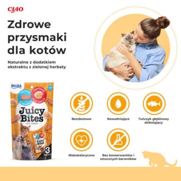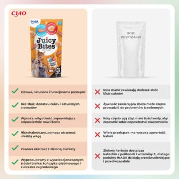 INABA CAT Soczyste Kęsy ryba i małża to wyjątkowe połączenie smaku i jakości, które spełnia oczekiwania nawet najbardziej wymagających kotów. Ich skład bazuje na najwyższej jakości składnikach, takich jak mięso tuńczyka i kurczaka pochodzące z certyfikowanych źródeł, które zapewniają wysoką wartość odżywczą. Każdy kęs jest soczysty i delikatny, a trzy osobno zapakowane porcje pozwalają utrzymać świeżość na dłużej. Dzięki niskokalorycznej formule oraz braku zbóż, konserwantów i sztucznych barwników, są one odpowiednie dla kotów w każdym wieku, w tym tych z wrażliwym układem pokarmowym. INABA CAT Soczyste Kęsy to zdrowa przekąska, idealna do stosowania jako nagroda lub smakołyk wzbogacający codzienną dietę kota.