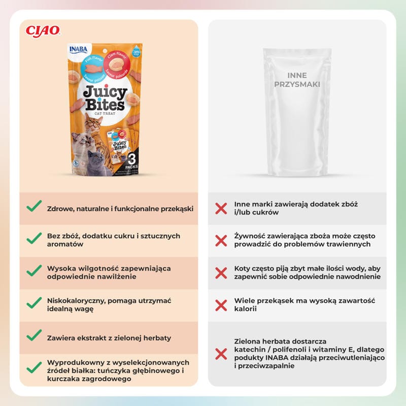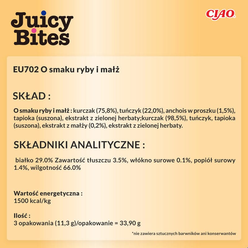 INABA CAT Soczyste Kęsy ryba i małża to przepyszne, soczyste kąski, które zachwycą nawet najbardziej wybrednego kota. Wyprodukowane z naturalnych składników, takich jak mięso tuńczyka i kurczaka, przysmaki te wzbogacone są o ekstrakt z zielonej herbaty i witaminę E, co wspiera zdrowie i dobre samopoczucie kota. Produkt nie zawiera zbóż, konserwantów ani sztucznych barwników, dzięki czemu jest bezpieczny i lekkostrawny. Dodatkowo, soczyste kęsy o smaku ryby i małży są doskonałym źródłem niskokalorycznej przekąski, idealnej dla kotów w każdym wieku, niezależnie od ich zapotrzebowania kalorycznego.