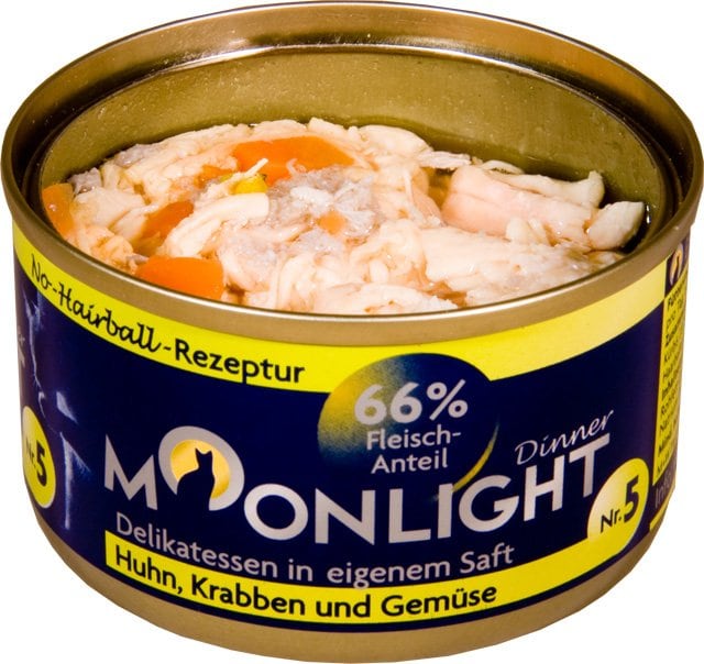 MOONLIGHT Dinner 5 jest w 100% naturalna i hipoalergiczna, co oznacza brak zbóż, glutenu, konserwantów oraz sztucznych dodatków. Dzięki temu jest bezpieczna dla kotów z wrażliwym układem pokarmowym i skłonnością do alergii. System NO-HAIRBALL, zawarty w produkcie, skutecznie zapobiega tworzeniu się kul włosowych, co znacznie podnosi komfort życia kotów. Świeże mięso kurczaka pochodzi z certyfikowanych hodowli, a kałamarnica i inne składniki są poławiane w czystych wodach oceanicznych i przetwarzane pod rygorystyczną kontrolą sanitarną.