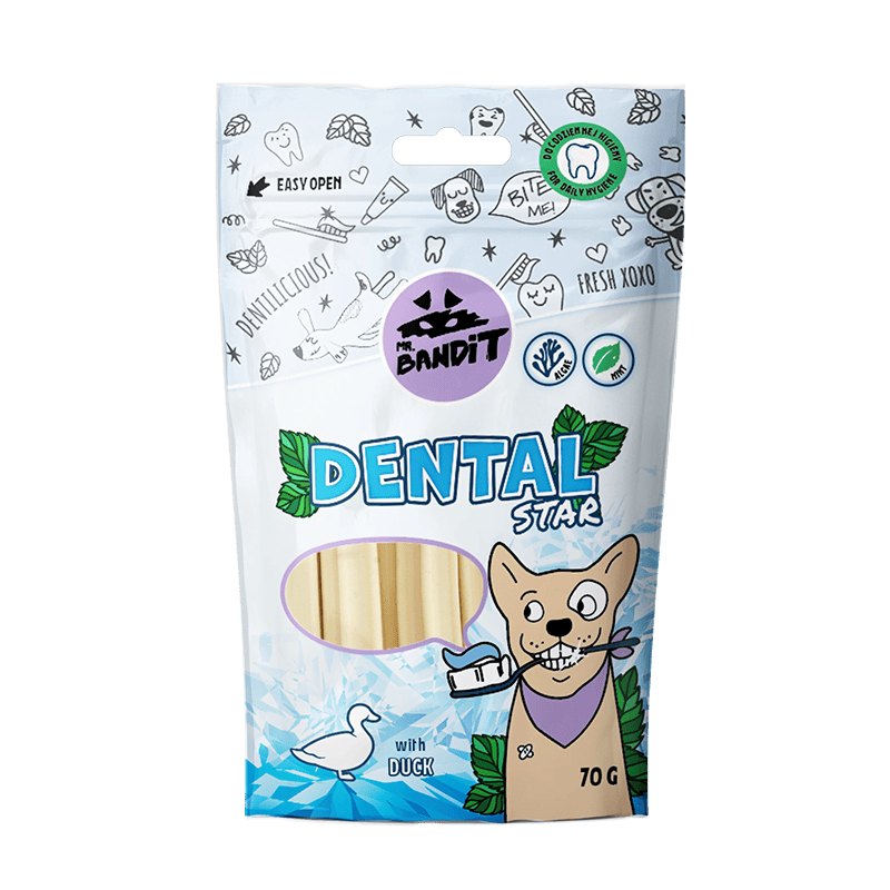 MR. BANDIT Dental Stars z kaczką dla psa 70g to klucz do zachowania zdrowego uśmiechu Twojego pupila. Ten wyjątkowy produkt nie tylko dba o higienę jamy ustnej psów, ale także dostarcza im niezapomnianej rozrywki. Zawarte w nim suszone algi i minerały wzmocnią zęby oraz dziąsła, zapobiegając tworzeniu się kamienia nazębnego i chorób przyzębia. Elastyczna struktura przysmaków sprawia, że są one nie tylko atrakcyjne dla psa, ale także skutecznie masują dziąsła, co dodatkowo przyczynia się do utrzymania zdrowej jamy ustnej. Dzięki tym właściwościom, MR. BANDIT Dental Stars z kaczką dla psa 70g to nie tylko przysmak, ale też ważny element codziennej pielęgnacji psa.