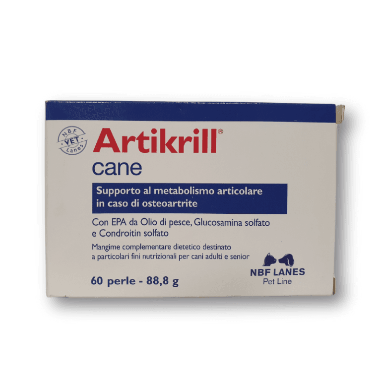 NBF Lanes Artikrill Dol Cane 60 kapsułek to specjalistyczny preparat dietetyczny, który został stworzony z myślą o psach cierpiących na problemy ze stawami, szczególnie w przebiegu osteoartrozy. Dzięki unikalnemu połączeniu kwasów omega-3, takich jak EPA pochodzące z oleju ryb, oraz witaminy E, produkt wspiera zdrowie i funkcjonowanie stawów, zmniejszając procesy zapalne oraz łagodząc dolegliwości bólowe. Preparat jest szczególnie polecany dla psów starszych, które mogą borykać się z ograniczoną ruchomością i bólem wynikającym z chorób zwyrodnieniowych.