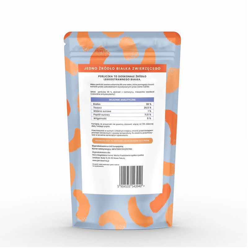 Skład: perliczka 99 %, ekstrakt z rozmarynu, mieszanka tokoferoli (naturalne antyoksydanty)