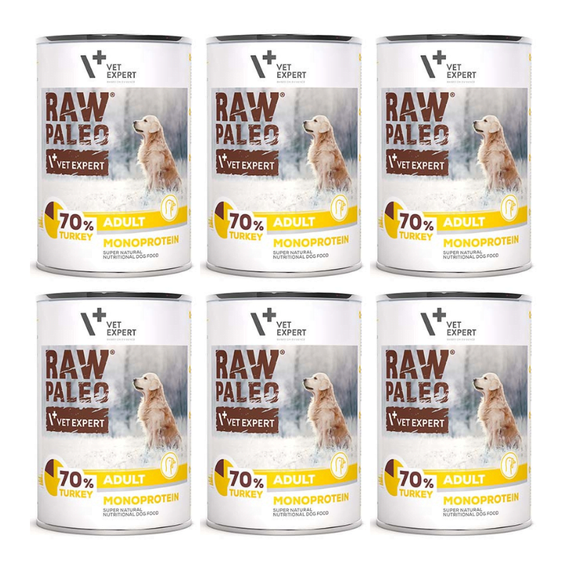 RAW PALEO mokra karma dla psów dorosłych indyk 6x400g, Twój pies otrzymuje wszystko, co potrzebne do zdrowego życia. Zawiera tylko jedno źródło białka zwierzęcego, co czyni ją idealnym wyborem dla psów o wrażliwym układzie pokarmowym. Ta karma to nie tylko posiłek, ale również zapewnienie zdrowia i witalności Twojego czworonoga.