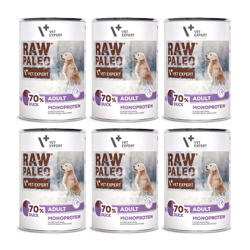 RAW PALEO mokra karma dla psów dorosłych z kaczką 6x400g jest przeznaczona dla psów dorosłych, powyżej 1 roku życia. Szczególnie polecana dla tych, którzy wymagają diety monobiałkowej lub mają wrażliwość pokarmową.