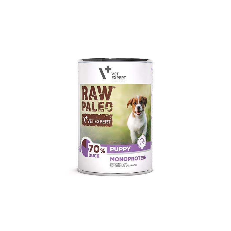 RAW PALEO mokra karma dla szczeniąt z kaczką 400g stworzona z myślą o potrzebach rosnących psów. Jest to karma monobiałkowa, co oznacza, że wszystkie składniki pochodzenia zwierzęcego pochodzą wyłącznie z kaczki. Jest to doskonały wybór dla młodych psów, które potrzebują pełnowartościowego odżywiania dla zdrowego wzrostu i rozwoju.