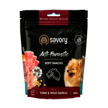 4820232631324 Savory miękkie przysmaki przeciwko pasożytom z tuńczykiem i dzikim czosnkiem dla psów 200 g.