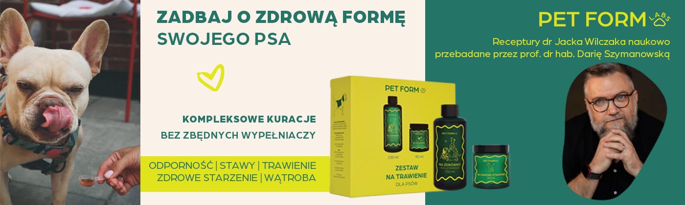 PET FORM LABS to polska marka tworząca zaawansowane suplementy diety dla psów, opracowane przez dr. Jacka Wilczaka – eksperta w dietoprofilaktyce i dietoterapii. Produkty powstają na podstawie najnowszych badań oraz wieloletniego doświadczenia, łącząc unikatowe składniki biologicznie czynne, takie jak ekstrakty roślinne, witaminy, minerały, tłuszcze i probiotyki. Kompleksowe formuły zaprojektowano, by wspierać zdrowie psów na każdym etapie życia, szczególnie seniorów, zapewniając im aktywność i dobre samopoczucie.