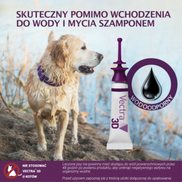 VECTRA 3D Roztwór dla psów 4-10kg na pchły i kleszcze to preparat zapewniający wszechstronną ochronę przed niebezpiecznymi pasożytami zewnętrznymi, takimi jak pchły, kleszcze, moskity, i komary, które mogą przenosić groźne dla zdrowia psa patogeny już przy jednym ugryzieniu. Dzięki unikalnemu aplikatorowi, VECTRA 3D Roztwór dla psów 4-10kg na pchły i kleszcze umożliwia łatwą i szybką aplikację na skórę czworonoga, oferując szybką ochronę o szerokim spektrum działania. Pasożyty giną zanim zdążą żerować na psie, co minimalizuje ryzyko przeniesienia chorób. Preparat działa przez 1 miesiąc, oferując długotrwałą ochronę i jest dostępny w pięciu wersjach, dostosowanych do różnych wag ciała psa. Może być stosowany u szczeniąt już od 7. tygodnia życia.