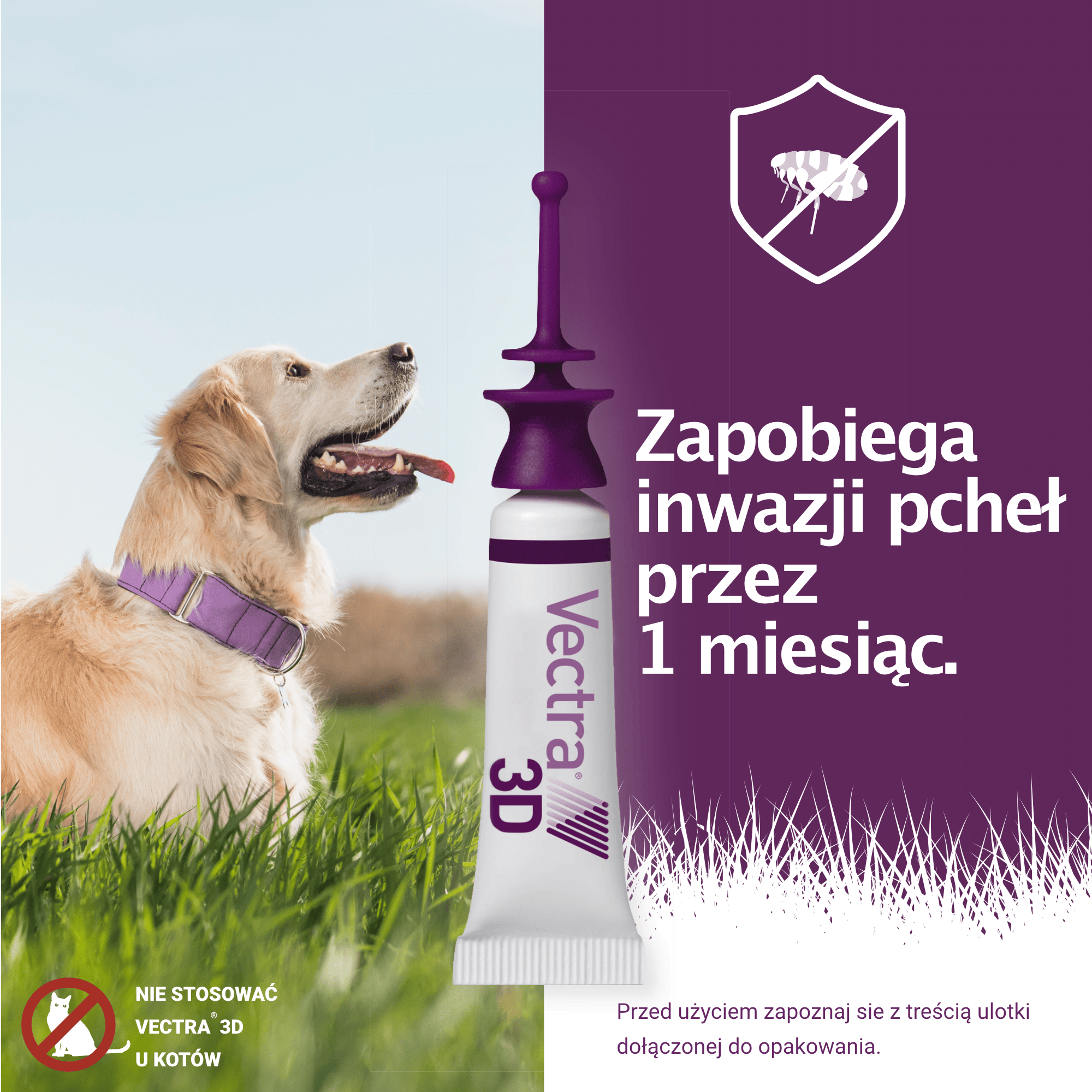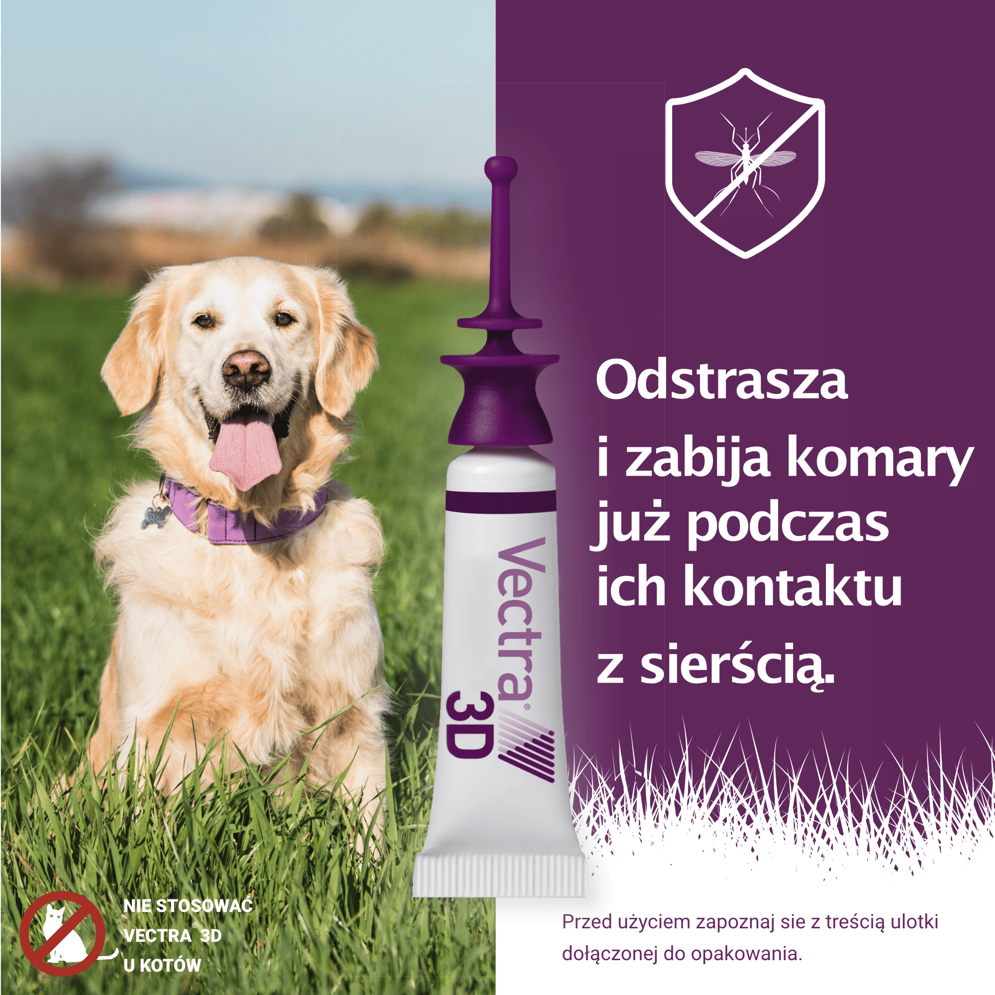 VECTRA 3D Roztwór dla psów 4-10kg na pchły i kleszcze to preparat zapewniający wszechstronną ochronę przed niebezpiecznymi pasożytami zewnętrznymi, takimi jak pchły, kleszcze, moskity, i komary, które mogą przenosić groźne dla zdrowia psa patogeny już przy jednym ugryzieniu. Dzięki unikalnemu aplikatorowi, VECTRA 3D Roztwór dla psów 4-10kg na pchły i kleszcze umożliwia łatwą i szybką aplikację na skórę czworonoga, oferując szybką ochronę o szerokim spektrum działania. Pasożyty giną zanim zdążą żerować na psie, co minimalizuje ryzyko przeniesienia chorób. Preparat działa przez 1 miesiąc, oferując długotrwałą ochronę i jest dostępny w pięciu wersjach, dostosowanych do różnych wag ciała psa. Może być stosowany u szczeniąt już od 7. tygodnia życia.