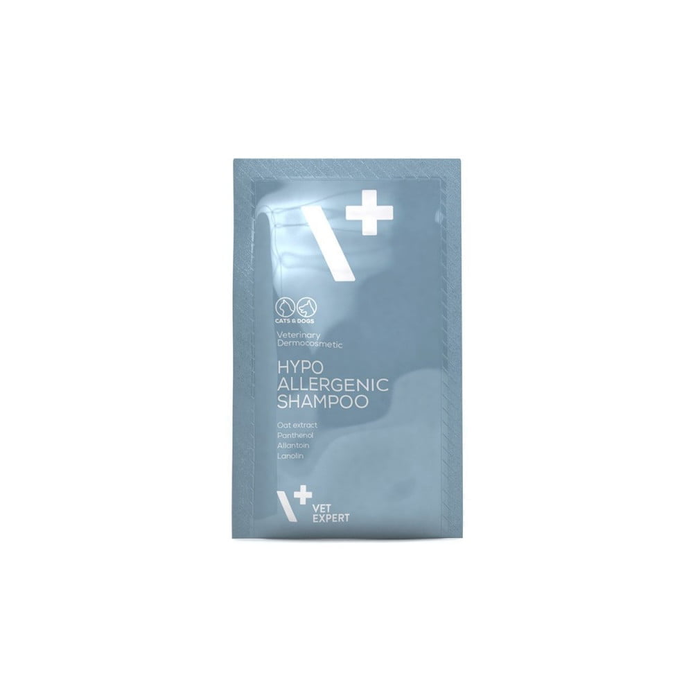 VET EXPERT Hypoallergenic Shampoo 15ml dla psów i kotów to hipoalergiczny szampon przeznaczony dla psów i kotów z wrażliwą, delikatną skórą, skłonną do podrażnień, uczuleń i przesuszenia. Ten dermatokosmetyczny produkt zawiera ekstrakt z ziaren owsa, alantoinę, pantenol i lanolinę, które razem tworzą formułę łagodzącą, nawilżającą i regenerującą skórę. Szampon jest idealny dla szczeniąt i kociąt oraz zwierząt z nietolerancją innych szamponów.