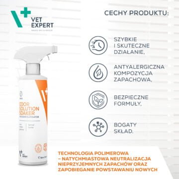 VET EXPERT Odor Solution Soaker Dog 500ml neutralizator to jedyny na rynku produkt, który skutecznie i trwale usuwa najbardziej uporczywe zapachy zwierzęce. Jego polimerowa technologia rozkłada molekuły odpowiedzialne za nieprzyjemne zapachy, czyniąc go skutecznym narzędziem w utrzymaniu czystości i higieny w domu. Antyalergiczna formuła zapachowa jest bezpieczna dla wrażliwych zwierząt, co czyni go doskonałym wyborem dla opiekunów czworonogów.