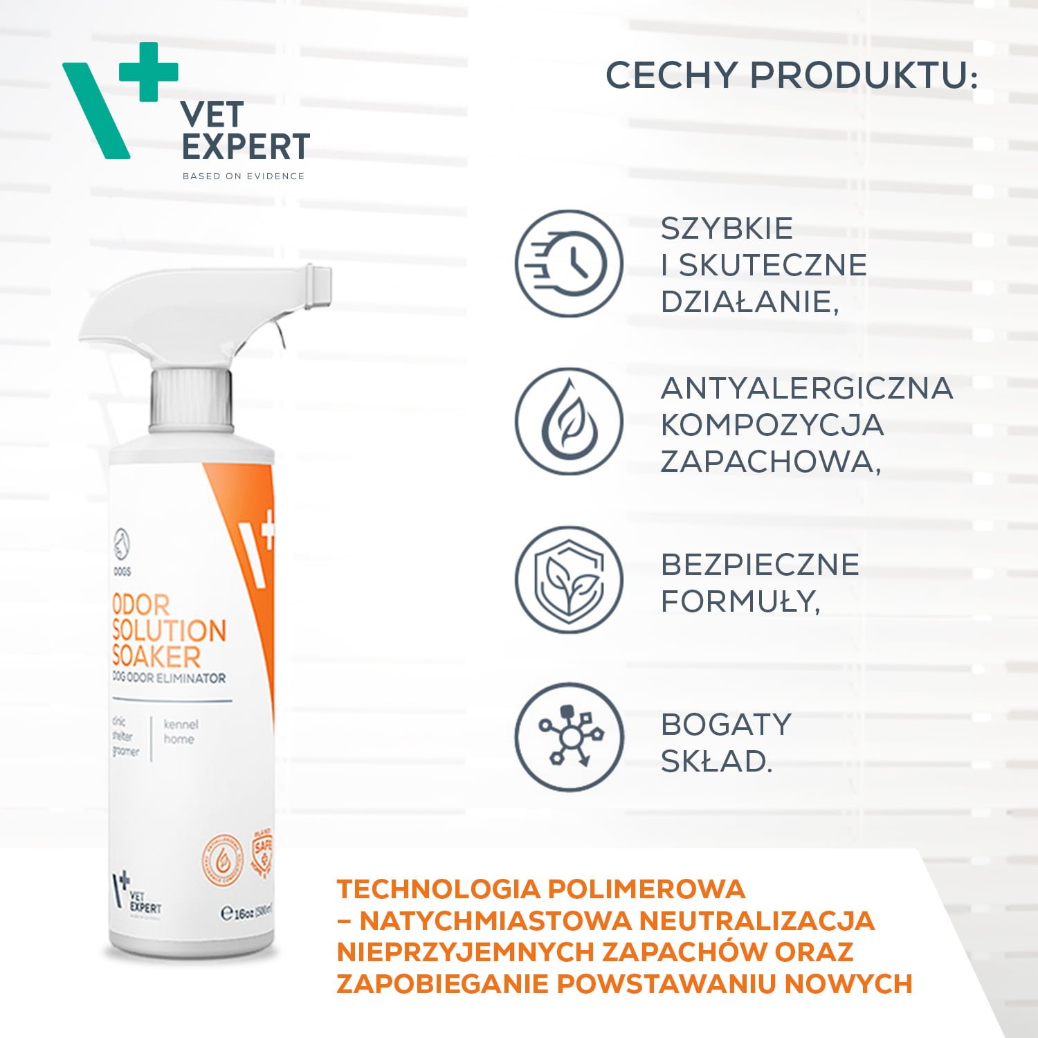 Polimerowa technologia wykorzystana w VET EXPERT Odor Solution Soaker Dog 500ml neutralizator jest nowoczesnym rozwiązaniem w neutralizacji zapachów, bazującym na procesie rozkładu molekuł odpowiedzialnych za nieprzyjemne zapachy. Ta innowacyjna metoda nie tylko eliminuje istniejące zapachy, ale również zapobiega ich ponownemu pojawianiu się, co jest kluczowe dla utrzymania czystości i świeżości w domach z psami.