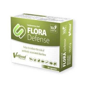 VETFOOD Flora Defense 30 kapsułek to synbiotyk zawierający czyste kultury drożdży Saccharomyces boulardii i bakterie kwasu mlekowego Lactobacillus rhamnosus LR06 oraz prebiotyk (oligofruktoza).Saccharomyces boulardii wykazuje naturalną oporność na antybiotyki, z wyjątkiem niektórych chinolonów oraz leków przeciwgrzybiczych. Drożdże te nie ulega trawieniu w przewodzie pokarmowym. Wykazują działanie przeciwzapalne i przeciwdrobnoustrojowe (enterokrwotoczne E. coli, Clostridium diffcile, Salmonella typhimurium, Yersinia enterolitica, Candida albicans, Candida krusei, Candida pseudotropicalis). Saccharomyces boulardii wytwarza proteazę inaktywującą toksynę A produkowaną przez Clostridium dificile.Lactobacillus rhamnosus LR06 – poprzez produkcję kwasu mlekowego, obniża pH w jelitach, hamując tym samym rozwój patogennych drobnoustrojów. Zdolność Lactobacillus rhamnosus LR06 do hamowania kolonizacji błony przewodu pokarmowego przez Clostridium perfringens u psów sięga 80%. Metabolity Lactobacillus rhamnosus LR06 stymulują miejscową, jak i ogólną odporność organizmu. Po wzbogaceniu diety w powyższy szczep drobnoustrojów stwierdzono wyższą wrażliwość receptorów komórkowych na insulinę i efektywniejszą utratę masy ciała, co wskazuje na możliwość wykorzystania Lactobacillus rhamnosus LR06 w procesie odchudzania. Ponadto u osobników otrzymujących w diecie Lactobacillus rhamnosus LR06 wykazano wyższe stężenie GABA – neuroprzekaźnika łagodzącego zaburzenia nastroju i obniżającego poziom odczuwanego lęku