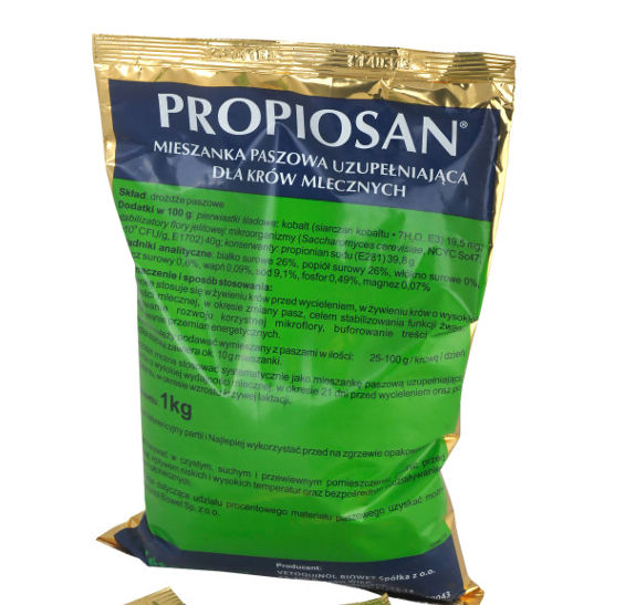 VETOQUINOL Propiosan 100g dla krów mlecznych to specjalistyczna mieszanka paszowa przeznaczona dla krów mlecznych, które są w okresie przed wycieleniem, po wycieleniu oraz w czasie wysokiej wydajności mlecznej. Jest to suplement diety wspierający stabilne funkcjonowanie żwacza poprzez stymulowanie rozwoju korzystnej mikroflory, buforowanie treści żwacza oraz aktywizowanie przemian energetycznych. Propiosan jest doskonałym rozwiązaniem w okresach zmiany pasz, zapewniającym odpowiednią kondycję zdrowotną i produkcyjną krów.