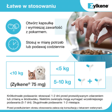 Zylkene 75 mg jest przeznaczony dla małych psów i kotów o masie ciała do 10 kg. Jest szczególnie pomocny w przypadkach, gdy zwierzęta są narażone na stresujące sytuacje lub zmiany w otoczeniu.