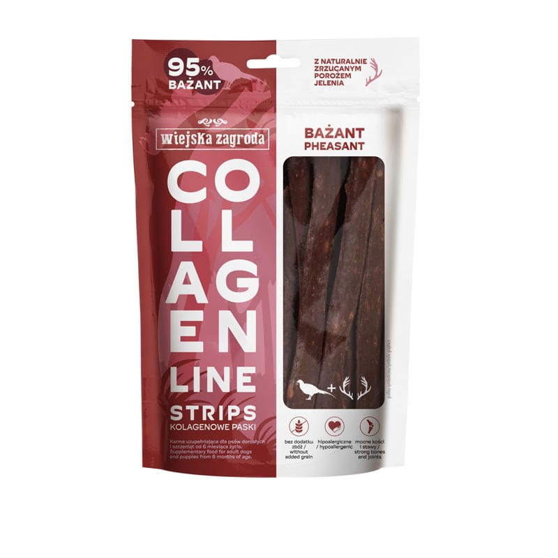 WIEJSKA ZAGRODA Kolagenowe Ciasteczka Bażant to wyjątkowo smaczna i zdrowa przekąska przeznaczona dla dorosłych psów oraz szczeniąt od 6. miesiąca życia. Wysoka zawartość mięsa z bażanta (95%) oraz kolagenu sprawia, że ciasteczka wspierają zdrowie stawów, chrząstek i skóry, jednocześnie dostarczając wartościowego białka niezbędnego do utrzymania zdrowej masy mięśniowej. Prosty skład, pozbawiony zbóż i zbędnych wypełniaczy, gwarantuje lekkostrawność oraz bezpieczeństwo dla psów o wrażliwym układzie pokarmowym.
