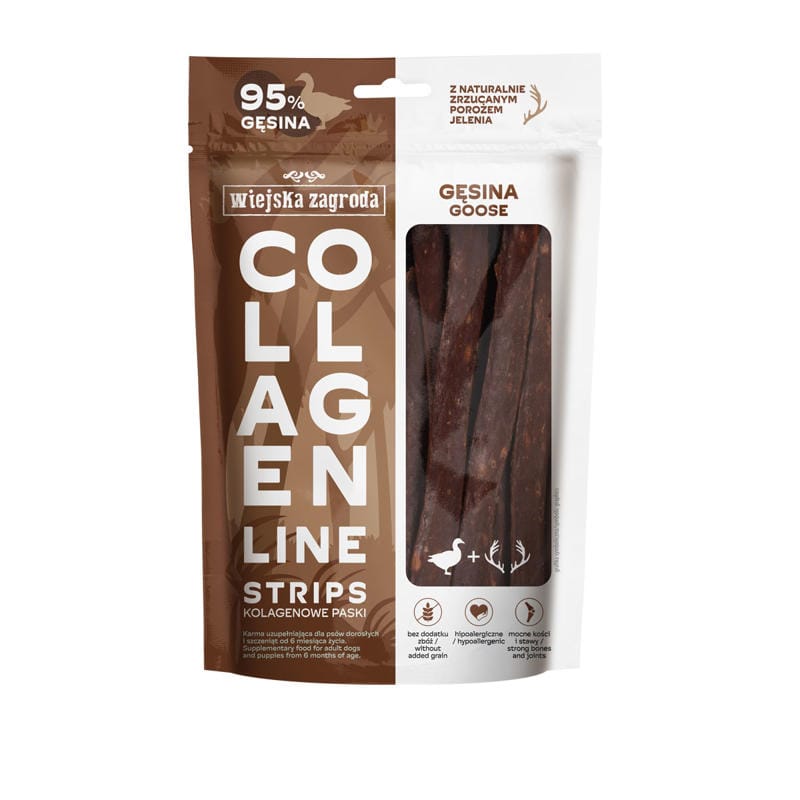 WIEJSKA ZAGRODA Kolagenowe Ciasteczka Gęś to wysokiej jakości karma uzupełniająca dla psów dorosłych i szczeniąt powyżej 6 miesiąca życia. Te smakowite paski stanowią zdrową przekąskę, która dostarcza psu cennych składników odżywczych bez zbędnych wypełniaczy. Dzięki prostemu składowi, bez dodatku zbóż, produkt zapewnia naturalne wsparcie dla organizmu Twojego pupila. Kolagen, który jest głównym składnikiem ciasteczek, wspomaga zdrowie stawów, skóry i sierści, a także przyczynia się do poprawy elastyczności tkanek.